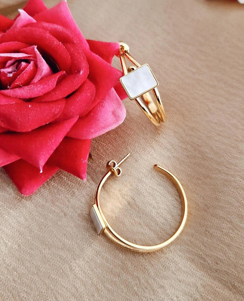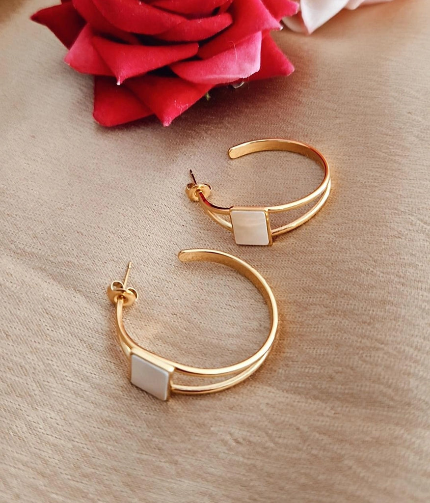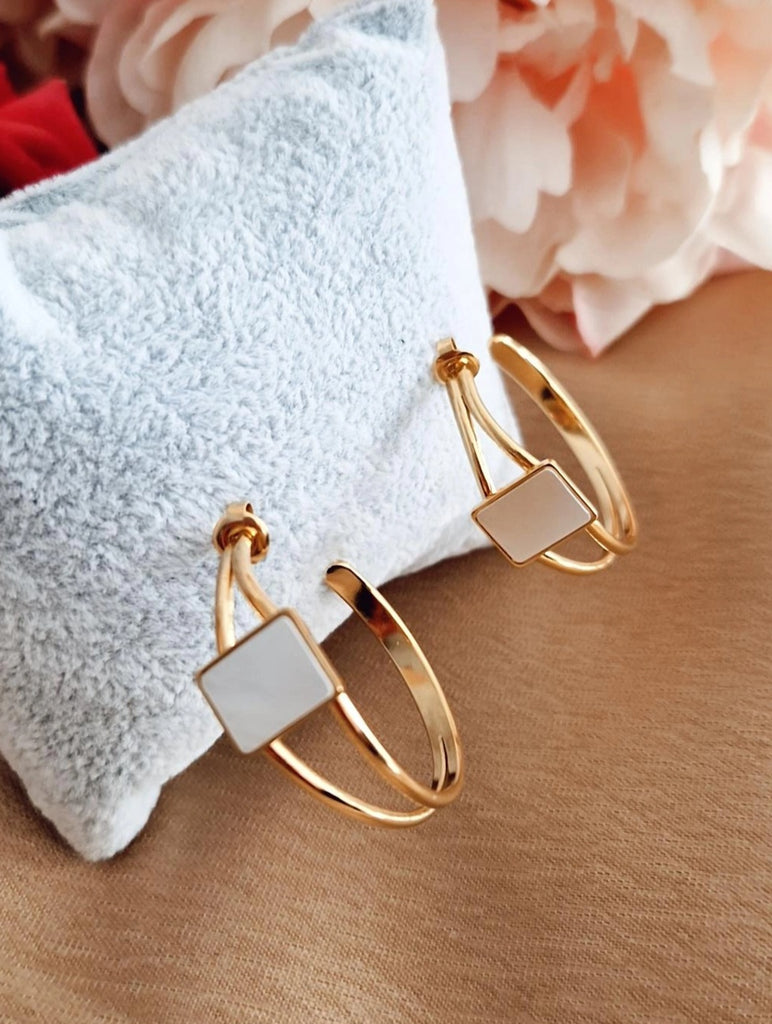 Boucles d'oreille créoles en acier inoxydable double rangs et pierre bleue ou blanche